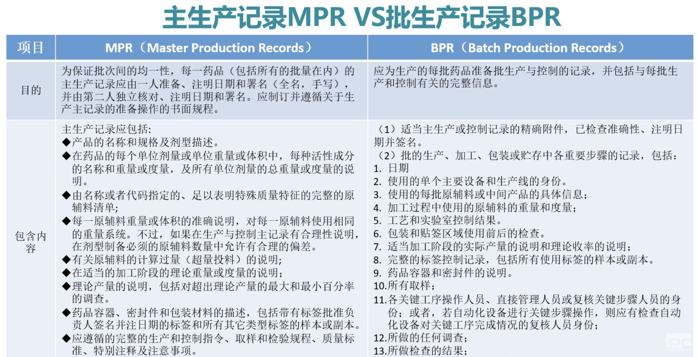 FDA的GMP文件中,提到了主生产记录(Master Production Records ,MPR)和批生产记录(Batch Production Records),很多人都可能对它们两个概念都很困惑,分不清楚,我们接下来就进行对比分析下。