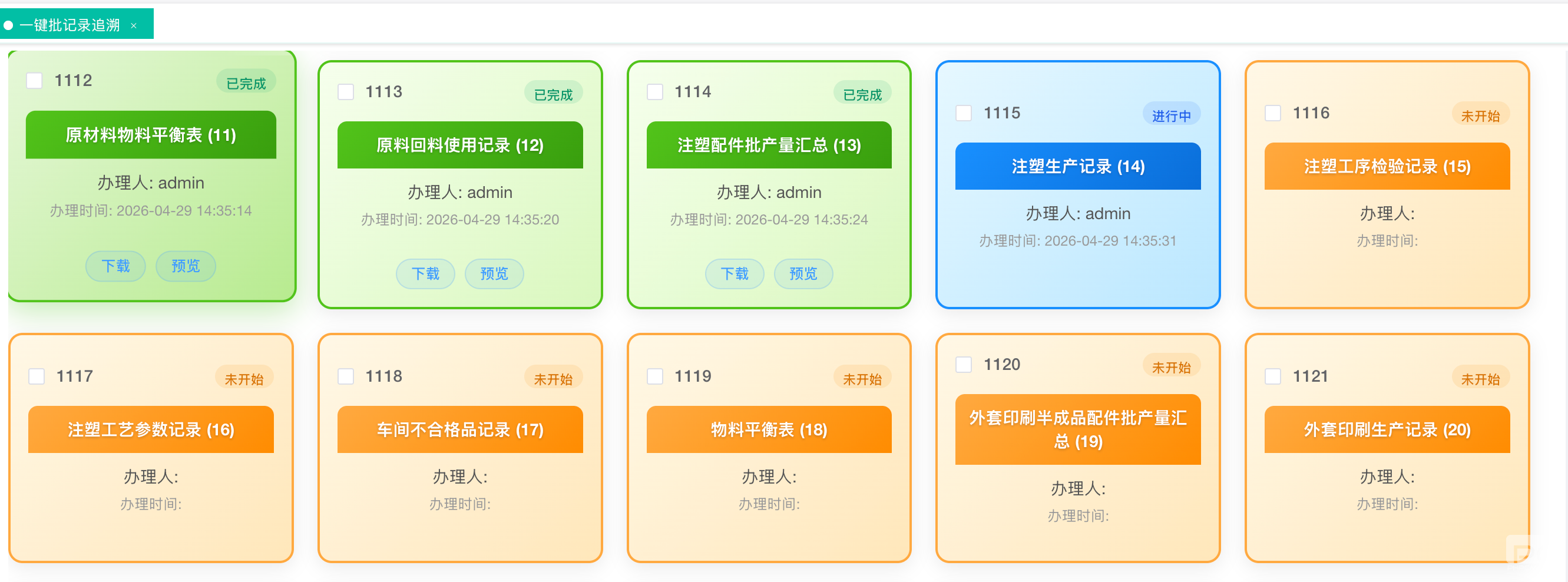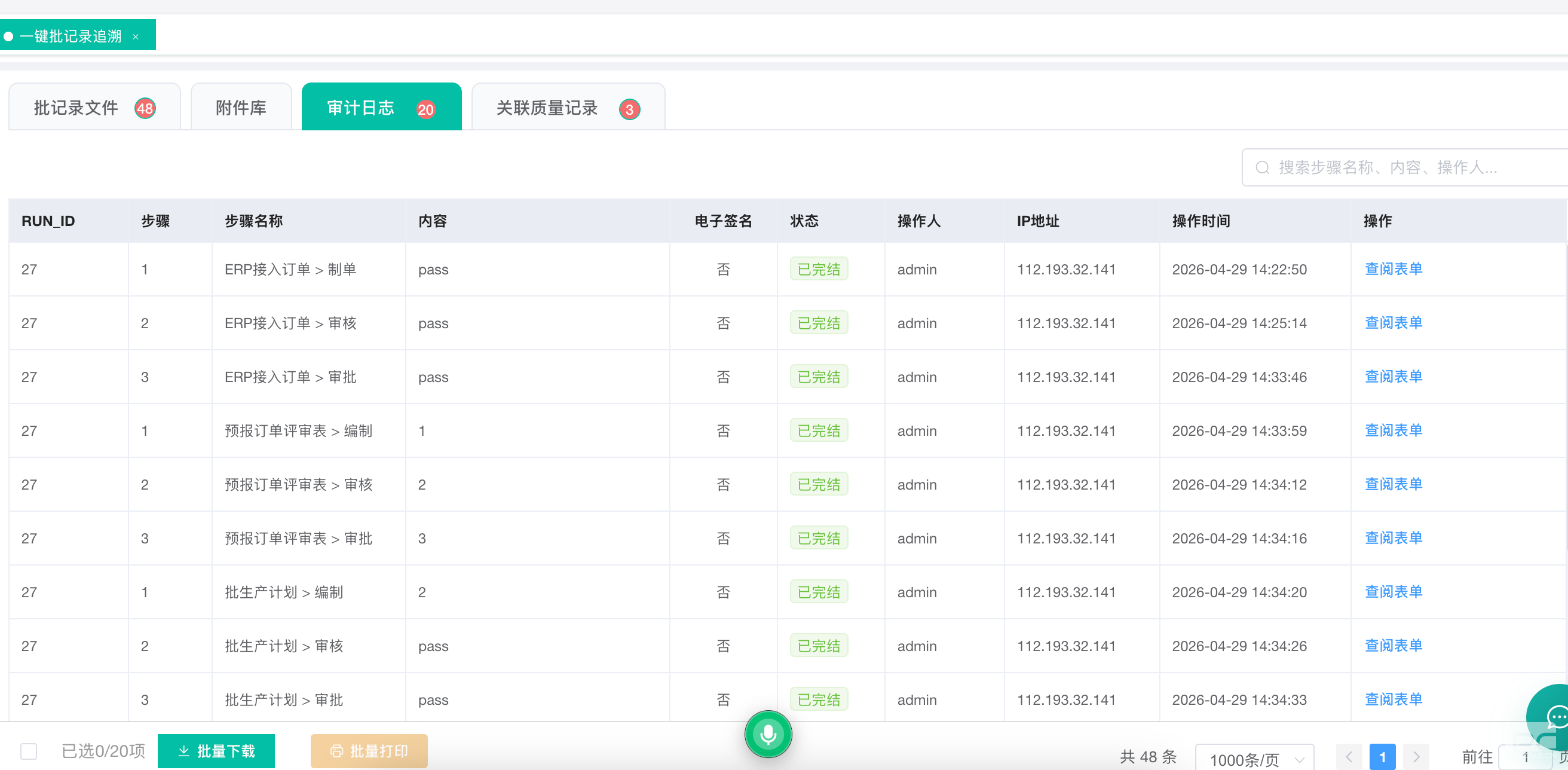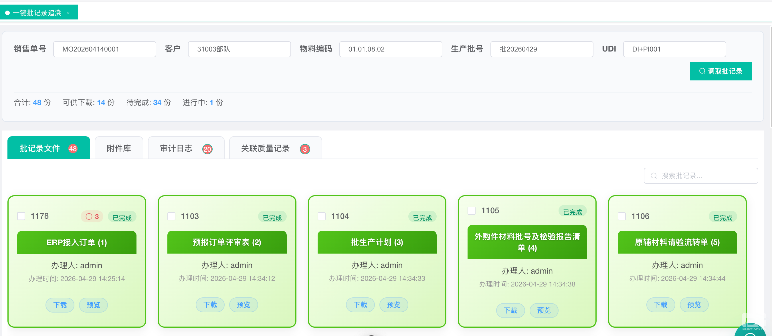 系统以唯一的生产批号为索引,一键即可调取与该批产品相关的全部数字足迹。如图所示,从ERP订单接入、生产计划、物料请验,到每一份检验报告,多达48份文件(已完成14份,流程中34份)的状态清晰可辨,支持一键预览与下载,彻底告别文件“躲猫猫”。