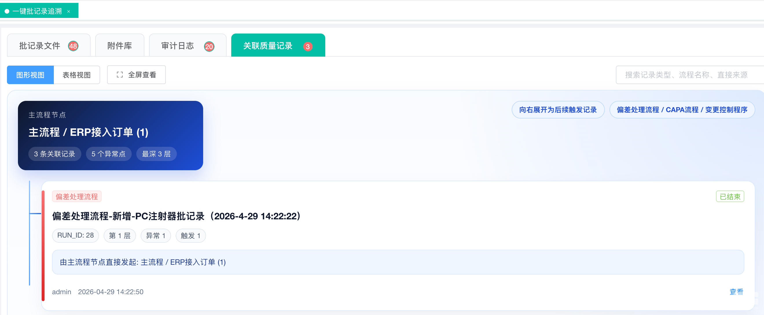 可视化图谱:如上图所示,系统直观展示“主流程→偏差→CAPA→变更”的完整传导链与层级关系,让质量事件的“前世今生”一目了然,为根本原因分析提供无可辩驳的电子证据链。